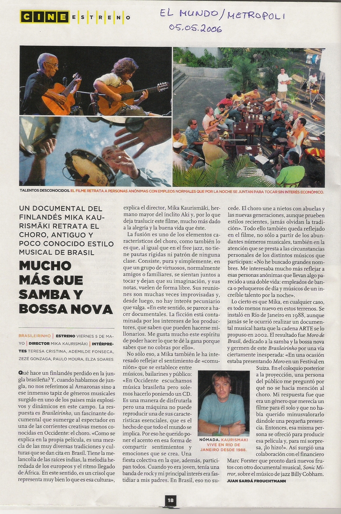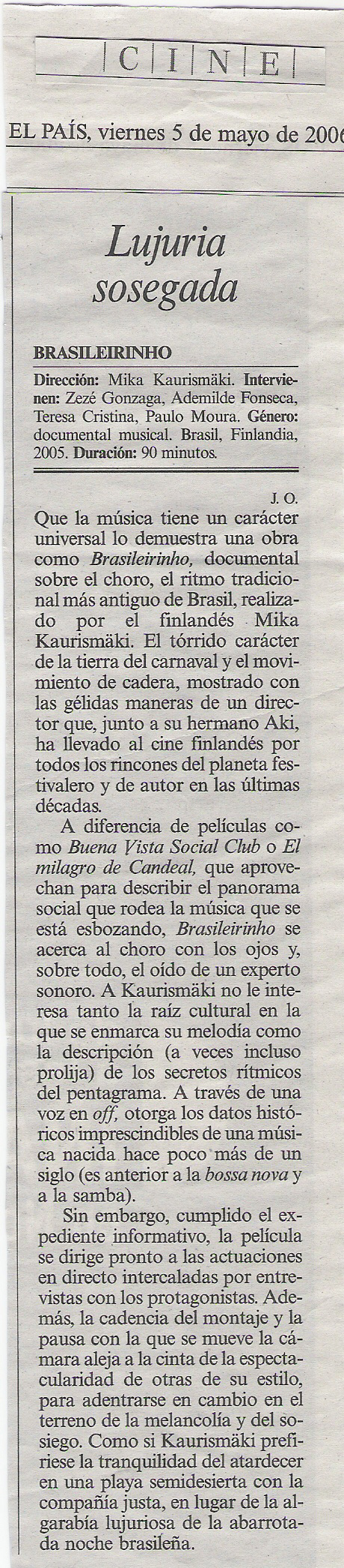 Como brasileiro náo poderia de forma alguma achar defeitos numa homenagem táo bonita e sincera feita à nossa cultura, ainda por cima vindo de alguém que não é brasileiro. Mas assumindo uma indevida neutralidade, eu diria que o filme mostra muito mais música, em tomadas realmente longas sem cortar as músicas no meio e deixa meio de fora a parte didática de informar mais a respeito do choro e de sua história. Conversando com outros gringos por lá tive a impressão geral de que todos adoraram a música, mas ficaram sem muito entender de suas histórias, de suas origens, e talvez o próprio Mika tenha talvez se desviado disso ele mesmo, por já conhecer muito bem a história do choro, tendo sido inclusive proprietário por alguns anos de um clube de música no Rio. Mas pra nós, brasileiros, o filme é imperdível e recomendado a qualquer um com o mínimo de sensibilidade musical. Estou certo de que este filme será figurinha fácil dos próximos festivais agora do fim de 2005 no Brasil. ZDF Aspekte, Deutschland Rhythmisch schwebend Ungebrochene Vitalität Das "Trio Madeira Brasil" mit den herausragenden Gitarristen Marcello Goncalves, Zé Paulo Becker und Rolando do Bandolim steht im Zentrum des Films. Wenn man die drei gleich am Anfang auf der Bühne sitzen sieht, uneitel und unglaublich virtuos die siebensaitige Gitarre und Mandoline spielend - dann erkennt man, warum der "Choro" heutzutage seine Wiedergeburt feiert und nicht nur in den Straßen und Armenvierteln, sondern auch in den Bars und Konzerthallen der großen Städte Brasiliens präsenter und lebendiger denn je ist. Ein magischer Moment Aber auch solo treten sie auf. So der massige Fingerakrobat Yamandú. Gänsehautig mit anzuschauen und zu -hören, wie er im großen Konzertsaal das Publikum in seinen Bann zieht, so dass der gesamte Saal fast andächtig eine bekannte Melodie zu seinen virtuosen Improvisationsklängen mitsingen. Ein magischer Moment, der lange nachhallt. Am Ende des Films stehen Menschen aus verschiedensten Regionen und sozialen Klassen gemeinsam auf der Bühne. War zu Beginn von einem unpolitischen Film die Rede? Mehr davon! Diário das Notícias, Lisboa, Portugal Chorinho leva Brasil a Berlim Jornal do Brasil Dia de chorinho na Alemanha Paulo Moura e o diretor de ‘Brasileirinho’, o finlandês Mika Kaurismaki, posam para foto BERLIM - Sábado foi dia de festa brasileira na Berlinale, regada a sets de chorinho. A Ballhaus Berlin, uma aconchegante casa de show e choperia em Mitte, bairro boêmio da antiga Berlim Oriental, ficou pequena demais para os chorões Paulo Moura, Yamandú Costa, Marcelo Gonçalves (do grupo Trio Madeira Brasil) e a sambista Tereza Cristina. Os quatro músicos são alguns dos protagonistas do documentário Brasileirinho, do finlandês Mika Kaurismaki, uma das atrações da mostra Forum do Festival de Berlim, e estavam comemorando ali, ao vivo, o sucesso da primeira sessão para o público do filme sobre a história e a vitalidade do gênero musical, co-produzido pela produtora brasileira Sky Light. Os quatro bambas também foram as principais atrações do quadro de perguntas e respostas que se seguiu à projeção de Brasileirinho, algumas horas antes, na sala Delphi Film Palast. O tradicional cinema do lado ocidental da cidade, um sala construída no final dos anos 40, com cerca de mil lugares e que já foi palco de festivais de jazz, ficou igualmente lotado de alemães, brasileiros e finlandeses - residentes ou de passagem por Berlim. Todos aparentemente encantados com as imagens bucólicas de Santa Teresa e Cordeiro, celeiro de bandas do interior do Estado do Rio, e com as histórias e as músicas do filme. Kaurismaki, que adotou o Rio como residência desde o final dos anos 80, começou o encontro explicando para a platéia em estado de graça que já havia feito um outro documentário sobre música brasileira, Moro no Brasil (2002), de forte conotação social, no qual a manifestação musical era mostrada como uma espécie de instrumento de sobrevivência do brasileiro. Em Brasileirinho, o personagem central é o choro, um gênero que, diferentemente do samba, nasceu na classe média carioca na segunda metade do século 19, sob influências européias e africanas. - Desta vez, eu falo sobre a música em si, as pessoas estão em volta dela. As rodas de choro envolvem muita gente - ensinou Kaurismaki, que reagiu com certa indiferença à comparação entre Brasileirinho e Buena Vista Social Club, o documentário de Wim Wenders sobre músicos cubanos. - Sou muito amigo dos realizadores do Buena Vista, mas o filme não serviu de inspiração para o meu - encerrou. Protagonista de um dos momentos mais emocionantes do longa-metragem, um solo de violão para Carinhoso (Pixinguinha), acompanhado pelo coro de um Teatro Municipal de Niterói lotado, o violinista gaúcho Yamandú Costa foi um dos mais convidados mais solicitados pelo público. Alguém quis saber se ele não achava uma situação estranha ter sido convidado por um diretor finlandês para falar sobre um tipo de música tão brasileira para a platéia de um país estrangeiro. - O brasileiro é um dos povos mais hospitaleiros do planeta, tem tradição de receber bem os estrangeiros. O Brasil é formado pela mistura de raças. Por isso, não acho nada estranho falar sobre nossa música para gente de fora. Até porque o choro mostra um pouco dessa miscigenação do país, ele é fruto dela - argumentou o músico. No filme, a cantora Tereza Cristina interpreta Marido da orgia. A canção de Ciro de Souza fala das queixas de uma mulher sobre o companheiro farrista. Tereza e a veterana Zezé Gonzaga são uma das raras aparições femininas no filme de Kaurismaki. Os homens predominam nas rodas de choro, da Penha a Santa Tereza, passando por Cordeiro e Niterói. ''Como é ser uma 'chorona' no mundo dos chorões?'', quis saber alguém da platéia. - Na verdade, eu não me considero muito uma chorona. Sou mais uma cantora e